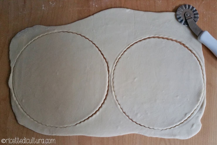 Qui vedete i due cerchi di sfoglia che differiscono per un cm di diametro. Vanno fatti riposare in frigo per dieci minuti.