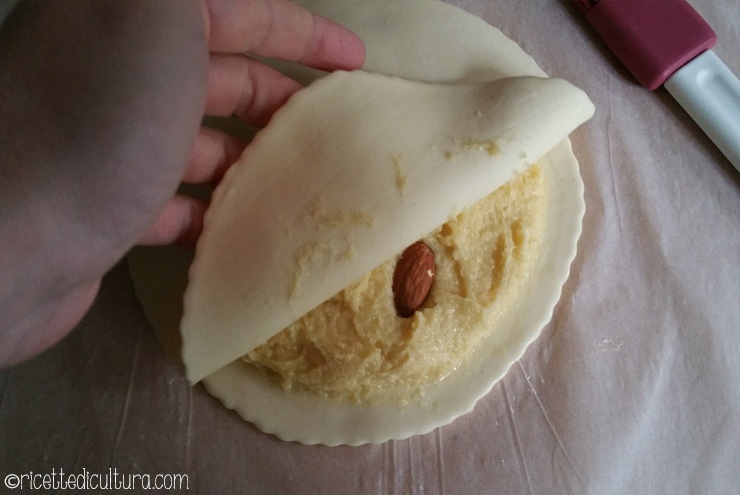 La farcitura, spalmata sul cerchio più piccolo, deve lasciare un cm e mezzo di bordo pulito. Poi si copre con il cerchio più grande, ricordandosi di mettere il fagiolo o la fava (o nel mio caso una mandorla).