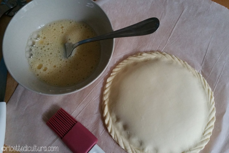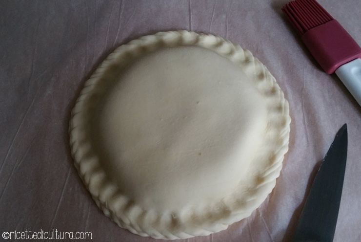 Fate quattro punzecchiature con la punta del coltello, spennellatela con l’uovo e fate la decorazione a piacere, incidendola in modo superficiale.