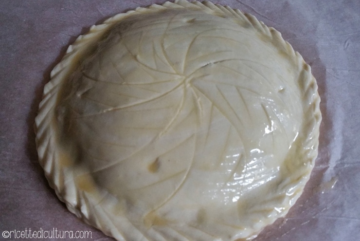 - Il bordo si inumidisce di acqua e il tutto viene coperto con il cerchio più grande. Bisogna far aderire perfettamente i due cerchi, poi la galette si ribalta, si preme ancora il bordo, e poi si può decorare in superficie: spennellarla di uovo sbattuto e, con la punta di un coltello, inciderla senza tagliarla profondamente. Infine pungerla in 4 punti.