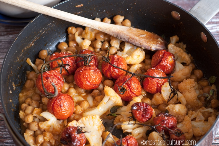 L’altro vantaggio è quello di poter utilizzare verdure diverse, a seconda della stagione e di quello che si nasconde nel vostro frigo. È ottima anche sostituendo il cavolfiore bianco con la zucca, con il sedano rapa, con sole patate o con le estivissime melanzane. I pomodorini e i ceci, invece, con i loro condimenti non cambiano.