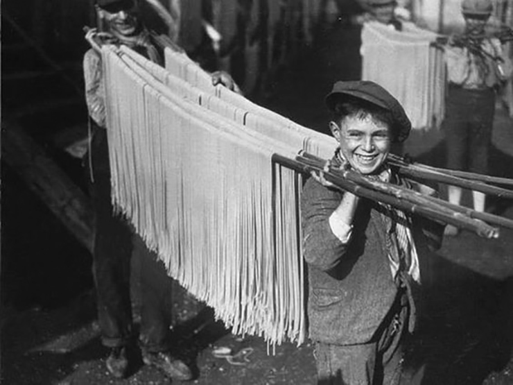 La primera cuenta que nació en manos de los trabajadores de los montes Apeninos empleados en la producción del carbón, los carbonai o carbonari en dialecto del lazio, que tenían que controlar continuamente las brasas para la preparación de la carbonilla y no podían distraerse con la preparación de una comida elaborada. Traían consigo “caio y ova” (pecorino y huevos), preparado antes y conservado en una lonchera. No utilizaban el aceite porque era demasiado caro sino guanciale o tocino. El nombre de la Carbonara no se refiere al hollín con el cual convivían sus “inventores”, sino a la pimienta que cubría la pieza de guanciale para conservarlo.