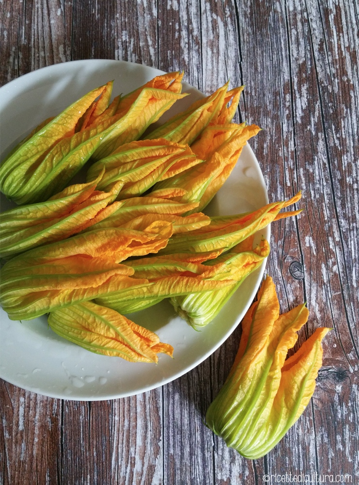 1. Lavate i fiori di zucca sotto un getto delicato di acqua fredda (per pochissimi secondi), metteteli ad asciugare su un panno e liberateli dal picciolo interno.