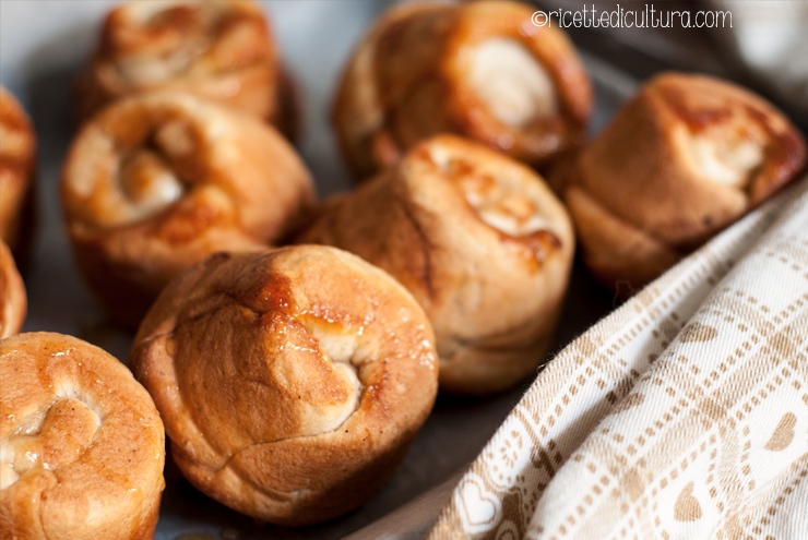 Questi dolci non presentano alcuna difficoltà, se non l’attenzione all’incordatura iniziale dell’impasto. Rispetto alla ricetta che ho trovato, ho ridotto la quantità di lievito e allungato i tempi di lievitazione. Il video suggeriva di porzionare l’impasto in pezzi da 80 g ciascuno. Io li ho fatti tra i 70 e i 73 g ciascuno e ne sono venuti 12, più uno piccino. Vi consiglierei di fare porzioni da 60 g e ridurre la cottura ai 15 minuti, così da avere proprio delle monoporzioni.