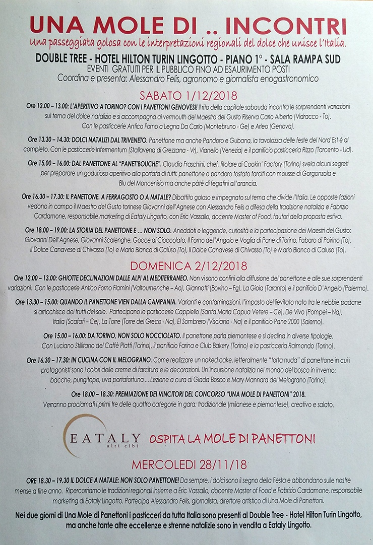 La kermesse inizia già il 28 novembre con un primo appuntamento presso Eataly Lingotto, al caffé letterario alle ore 18,30, in cui si parlerà di tradizioni regionali natalizie di tutta Italia con Eric Vassallo, docente Master of food, Fabrizio Cardamone, responsabile marketing Lingotto, e Alessandro Felis, giornalista e direttore artistico di “Una Mole di Panettoni”. Dopo il dibattito ci sarà una degustazione.
