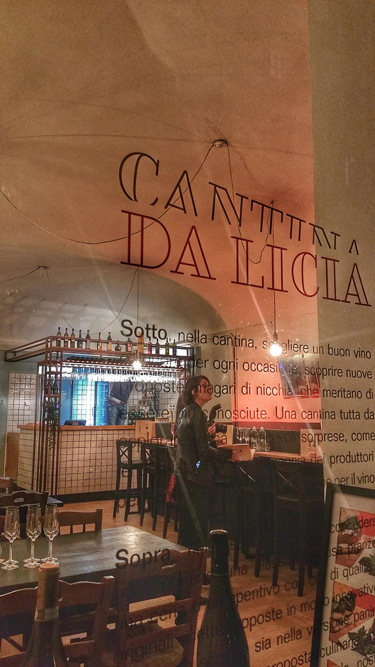 Dal 22 ottobre 2018 negli stessi locali, rimessi a nuovo conservando l’idea di un’atmosfera d’antan, nasce Cantina Da Licia, con una doppia natura: sopra pausa pranzo o cena o merenda sinoira e aperitivo di tutto rispetto, sotto cantina prêt à porter.