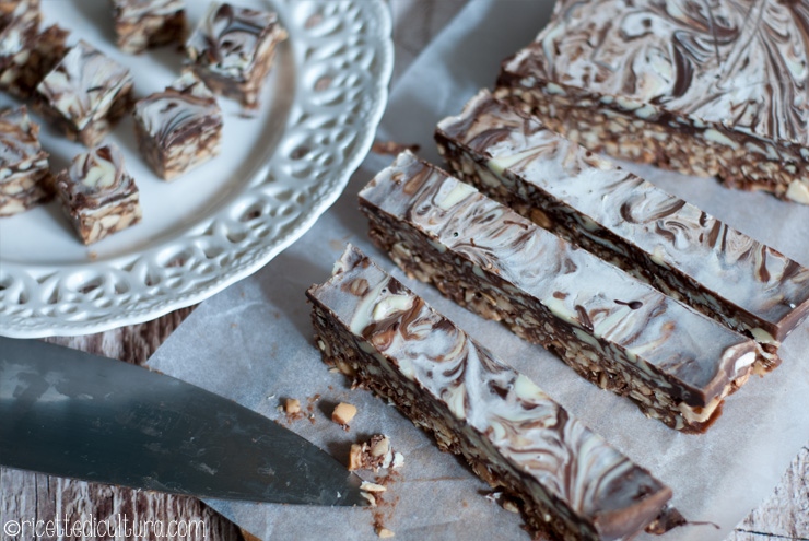 La ricetta originale prevedeva la copertura di cioccolato al latte assieme al bianco, io ho usato il fondente per mitigare la dolcezza del risultato finale.