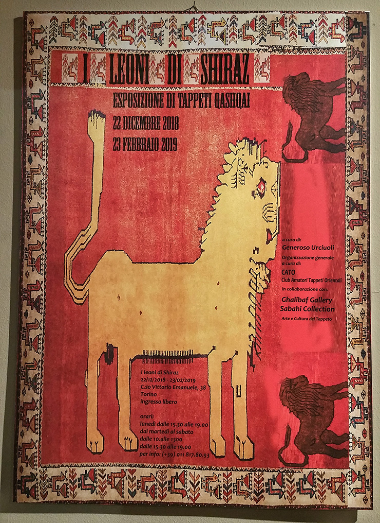 Su tappeti di lana, annodati a mano con una tecnica antichissima, da soli o che si affrontano: i leoni di Shiraz sono il simbolo della cultura nomade Qashqai, ora in esposizione alla galleria Ghalibaf. Dal 22 dicembre fino al 23 febbraio 2019 in corso Vittorio Emanuele II 38, presso la galleria Ghalibaf sono esposti alcuni tappeti Qashqai che hanno come denominatore comune la raffigurazione del leone, simbolo importantissimo nella cultura persiana e di queste tribù nomadi.