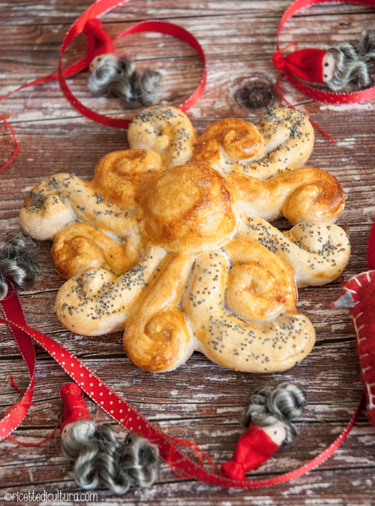 Impastate, fate lievitare e divertitevi a formare il vostro sole di pane. Poi non attendete troppo ad infornare, giusto una mezz’ora in questo caso è sufficiente. I differenti colori sono dati da uovo spennellato in due momenti e da semini di papavero.