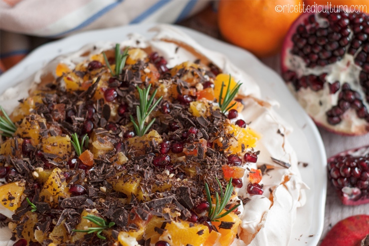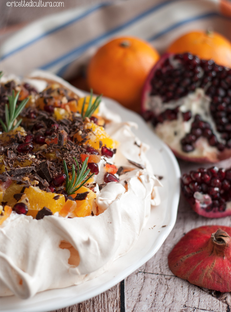 Sulla pavlova potete mettere la frutta che volete, avendo cura di usare almeno un tipo che dia una nota acidula e alleggerisca la dolcezza del tutto. D’estate mi piace usare dei frutti di bosco, d’inverno la dolcezza acidula della melagrana è perfetta.