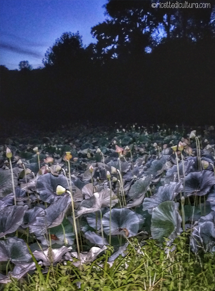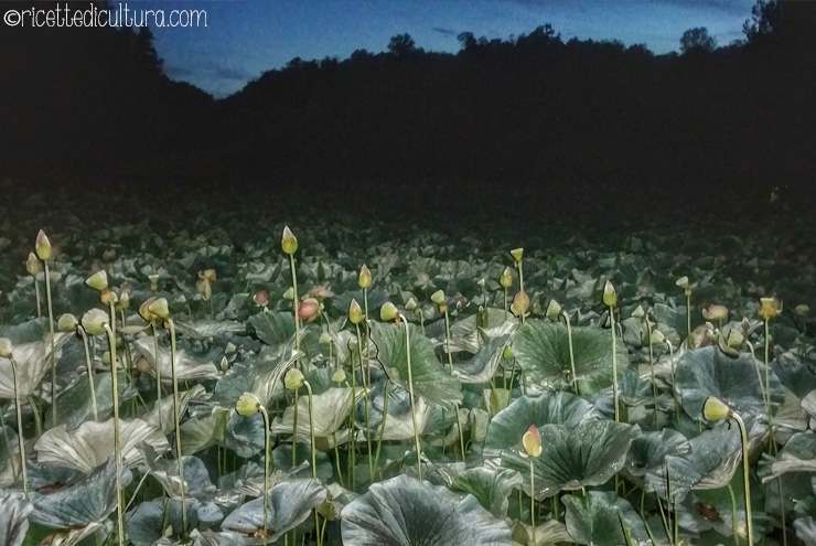 A metà strada abbiamo avuto la sorpresa nel buio e ci siamo raccolti davanti al magico specchio d’acqua del laghetto dei fiordiloto. Vederlo di giorno è uno spettacolo incredibile, una distesa di fiori rosa; ma anche di notte lo spettacolo è impagabile, soprattutto se non ce lo si aspetta.