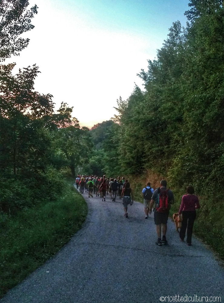 Nel nostro caso abbiamo seguito il noto sentiero del Trifolau, ben segnalato. Abbiamo visto la luna sorgere e siamo partiti. Il gruppo era folto e l’inizio della camminata si è svolto durante il tramonto.