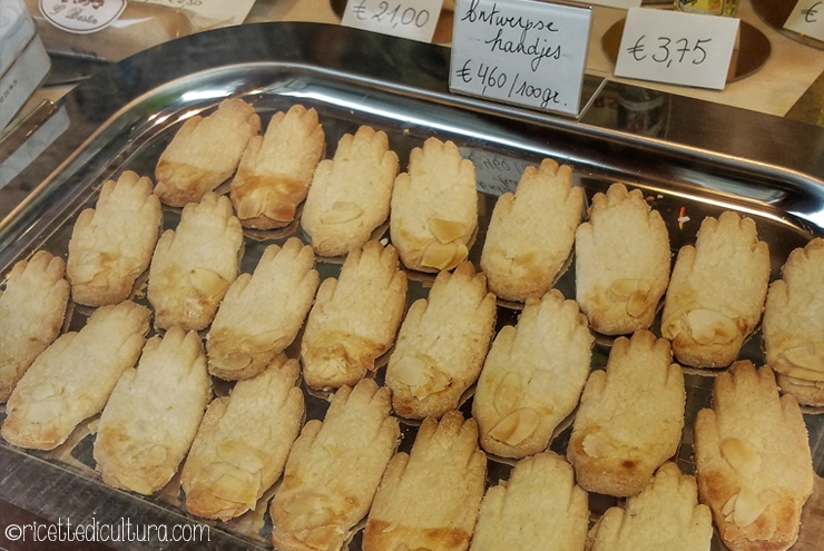 Naturalmente il simbolo della città non poteva non avere la sua versione culinaria, le “manine di Anversa” in versione frolla alle mandorle o cioccolatino a forma di mano, naturalmente.