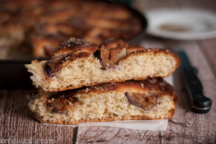 La mia focaccia dolce ai fichi è stesa in una teglia tonda da 35 cm di diametro: ben avvolta in pellicola si è conservata soffice per 2 giorni. Se si secca un po’, prima di consumarla mettetela nel forno ben caldo per due minuti al massimo: tornerà soffice.
