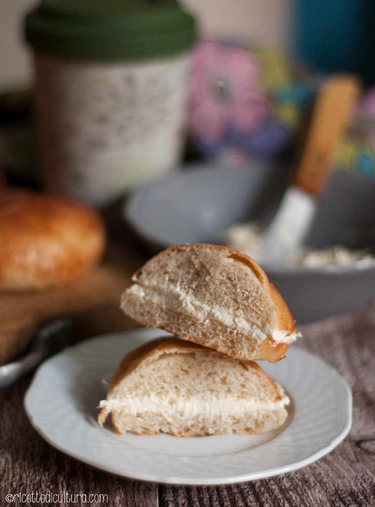 Aprire a metà ogni panino e metterci una cucchiata di crema, pareggiando il bordo.