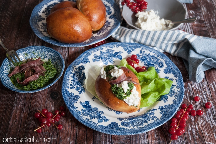 Quando sono freddi potete farcirli, dividendoli in due come panini o ricavando una fossetta in alto. Guarnite con un poco di salsa verde, abbondante Seirass e altra salsa verde con le acciughe che vi si trovano dentro.