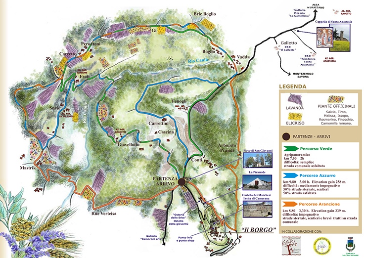 I percorsi per esplorare questo territorio sono tre: uno è quello più semplice, il verde, sulla strada asfaltata che costeggia quasi tutti i campi. È un percorso facile, quindi vi sono dei saliscendi dolci percorribili da chiunque non abbia problemi di mobilità, anche con eventuali passeggini. Esistono poi due itinerari alternativi, l’azzurro e l’arancione, con difficoltà diverse.
