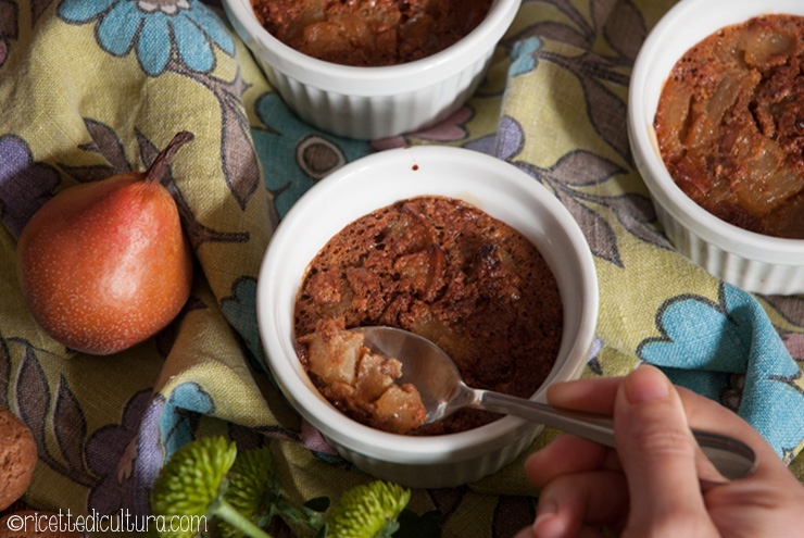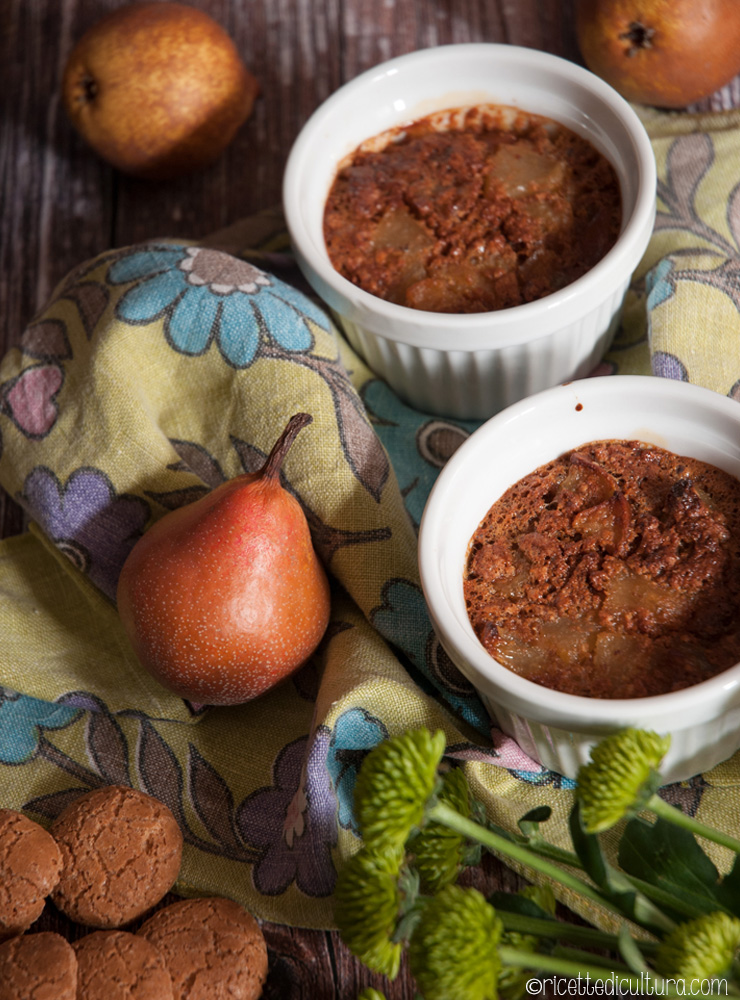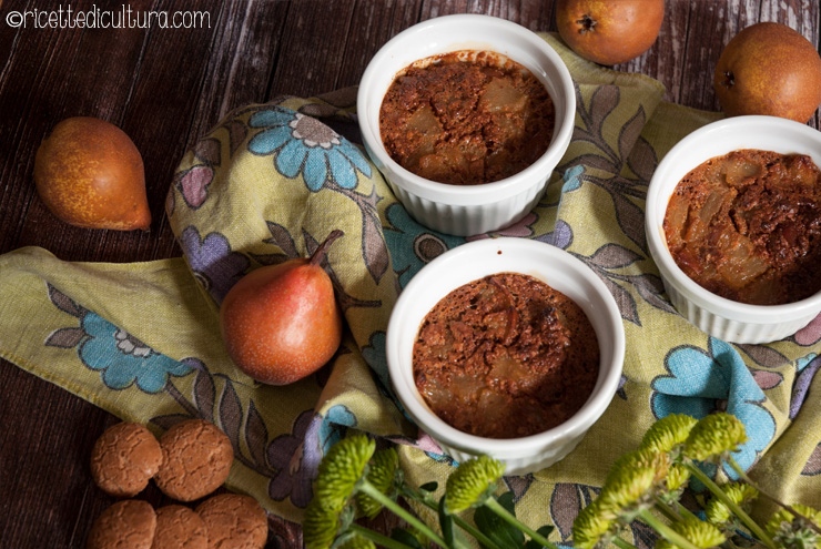 Distribuire il composto di pere. Preparare una teglia con 2 dita di acqua bollente e disporci i ramequin. Infornare per circa mezz’ora o finché il dolce risulta sodo.