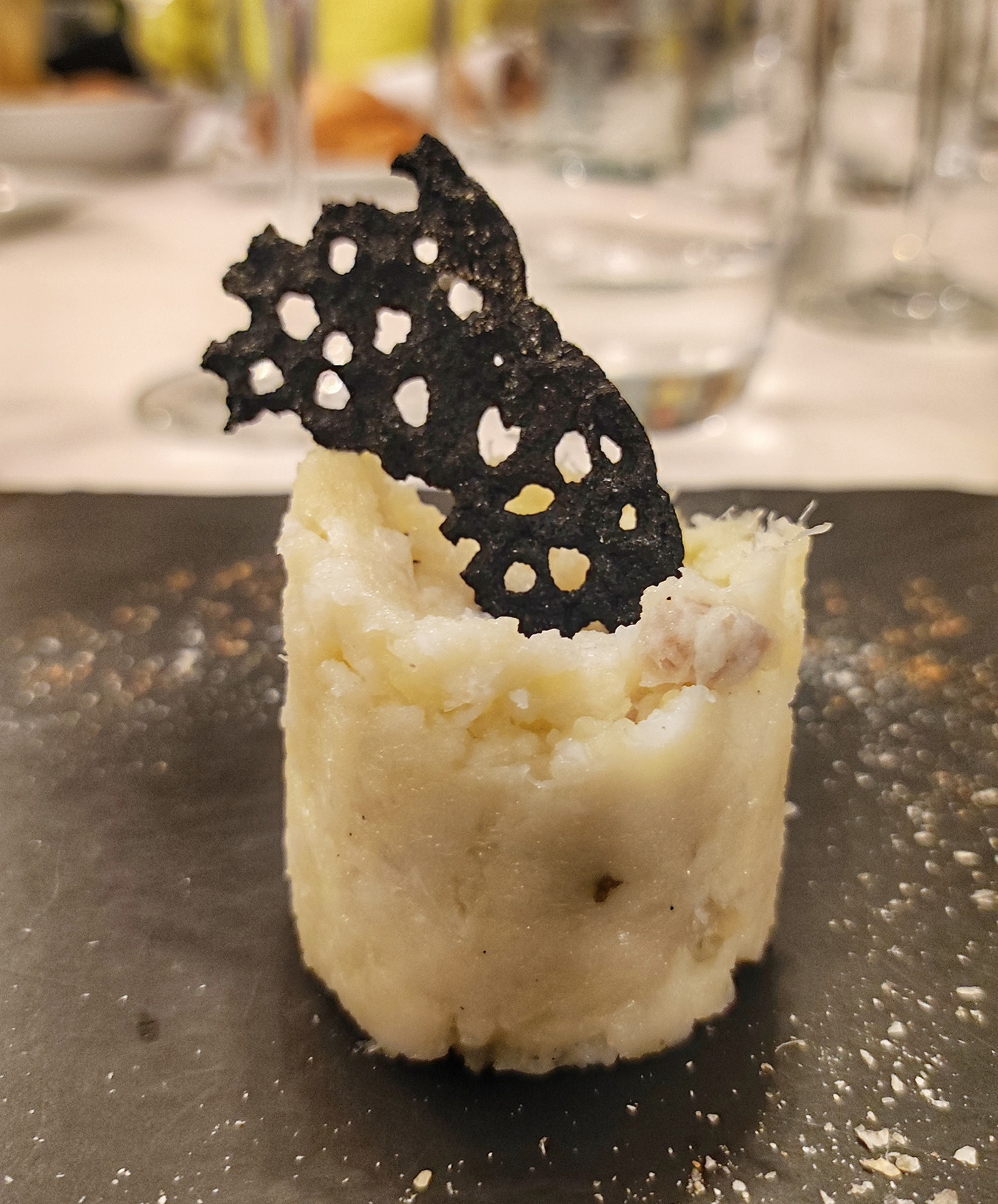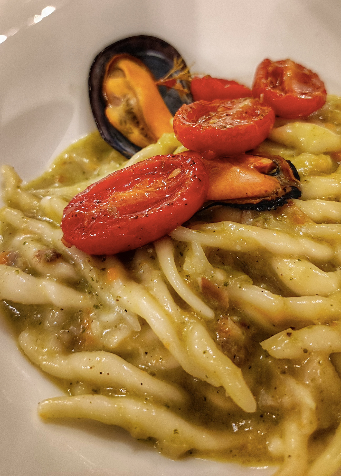 cataplana, zuppa portoghese di pesce con pomodoro, baccalà, gambero, cozze, vongole e crostini. Ci sono poi gli gnocchi al nero con zucca, vongole, amaretto e baccalà.